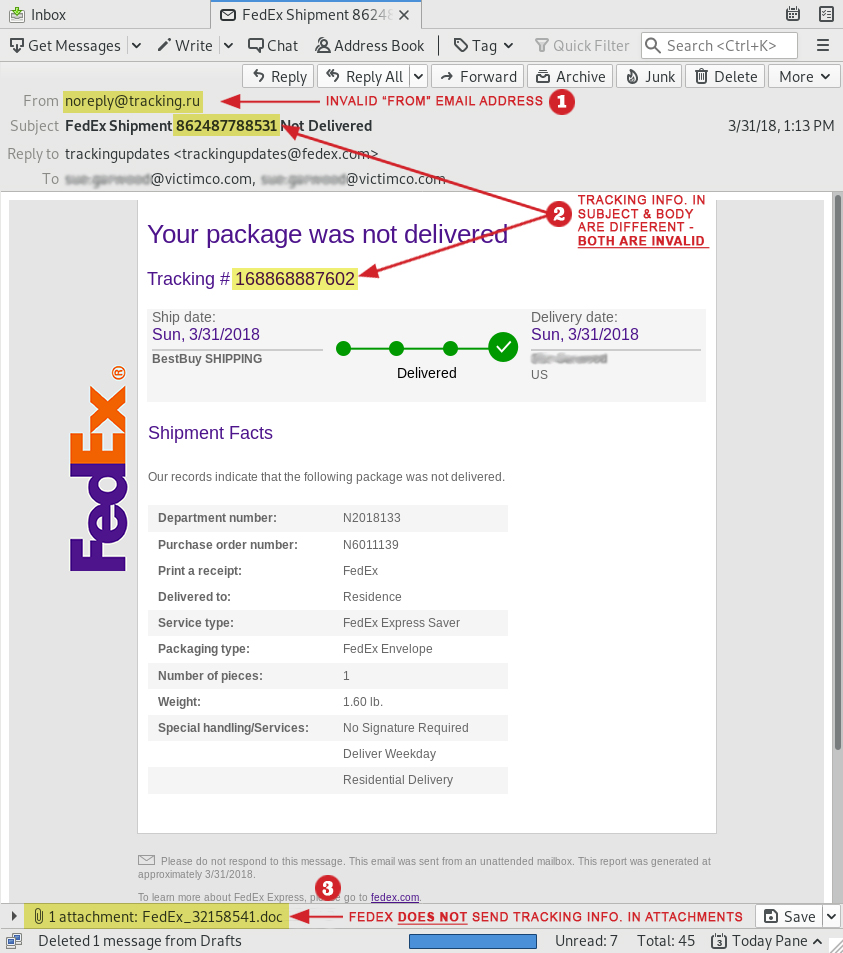 • A malicious attachment is located in the bottom left corner; FedEx does not send tracking information as an attachment.