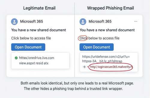 You’ve seen these rewritten links before. Instead of pointing to a direct destination like onedrive.live.com, the URL might start with something like urldefense.example.com or linkprotect.securityhost.net. These are examples of trusted link wrappers, commonly used by secure email gateways and threat protection platforms.