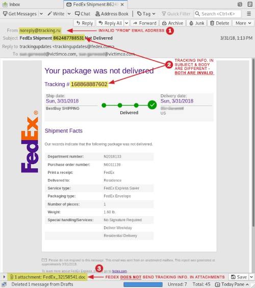Check out this sample email. It looks fine at first glance—it's a delivery confirmation from FedEx. But it is a really well-designed phishing attempt. Here are some signs that it is fake:FedEx phishing email example highlighting suspicious email characteristics-esm-w500.webp